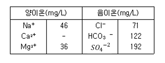 다음은 수질조사에서 얻은 결과인데, Ca^{2+} 결과치의 분실로 인하여 기재가 되지 않았다. 주어진 자료로부터 Ca^{2+} 농도(mg/L)는?