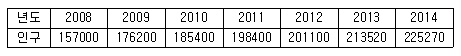 도시의 상수도 보급을 위하여 최근 7년간의 인구를 이용하여 급수인구를 추정하려고 한다. 최근 7년간 도시의 인구가 다음과 같은 경향을 나타낼 때 2018년도의 인구를 등차급수법으로 추정한 것은?