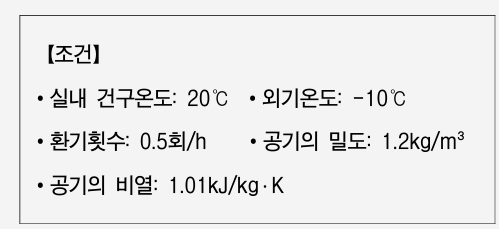 다음과 같은 조건에서 바닥면적 \rm 300m^2, 천장고 \rm 2.7m인 실의 난방부하 산정 시 틈새바람에 따른 외기부하는?