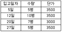 다음은 간장의 재고 대상이다. 간장의 재고가 10병일 때 선입선출법에 의한 간장의 재고자산은 얼마인가?