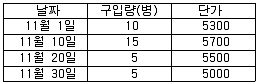 다음은 한 급식소에서 한 달 동안 참기름을 구입한 내역이며, 월말의 재고는 7개이다. 선입선출법에 의하여 재고자산을 평가하면 얼마인가?