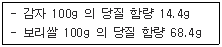 아래의 조건에서 당질 함량을 기준으로 감자140g을 보리쌀로 대치하면 보리쌀은 약 몇 g이 되는가?