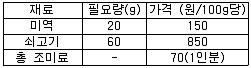 미역국을 끓일 때 1인분에 사용되는 지료와 필요량, 가격이 아래와 같다면 미역국 10인분에 필요한 재료비는? (단, 총 조미료의 가격 70원은 1인분 기준임)