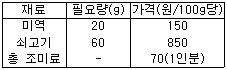 미역국을 끓일 때 1인분에 사용되는 재료와 필요량, 가격이 아래와 같다면 미역국10인분에 필요한 재료비는? (단,총 조미료의 가격 70원은 1인분 기준임)