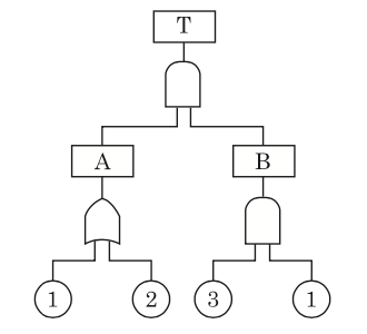 그림과 같은 FT도에 대한 최소 컷셋(minimal cut sets)으로 옳은 것은? (단, Fussell의 알고리즘을 따른다.)