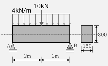 그림과 같은 하중을 받는 단순보에서 단면에 생기는 최대 휨응력도는? (단, 목재는 결함이 없는 균질한 단면이다.)