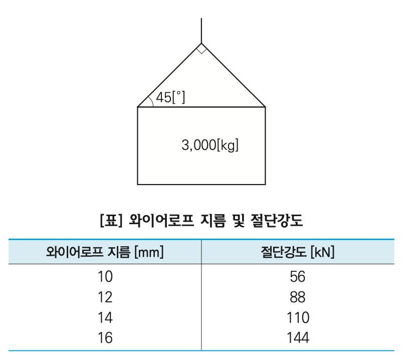 인 각도로 그림과 같이 2개의 와이어로프로 직접 들어올릴 때, 안전율이 고려된 가장 적절한 와이어로프 지름을 표에서 구하면? (단, 안전율은 산업안전보건법령을 따르고, 두 와이어로프의 지름은 동일하며, 기준을 만족하는 가장 작은 지름을 선정한다.)
