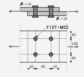그림과 같은 단순 인장접합부의 강도한계상태에 따른 고장력볼트의 설계전단강도는? (단, 강재의 재질은 SS275, 고장력볼트 M22(F10T), 공칭전단강도 F_{\mathrm{rw}}=500 \mathrm{MPa}, \phi=0.75)