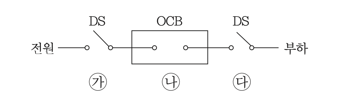 전류가 흐르는 상태에서 단로기를 끊었을 때 여러가지 파괴 작용을 일으킨다. 다음 그림에서 유입차단기의 차단 순서와 투입순서가 안전수칙에 가장 적합한 것은?