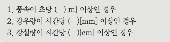 철골작업을 중지하여야 하는 악천후의 조건이다. 순서대로 ( ) 안에 알맞은 숫자를 순서대로 옳게 나열한 것은?