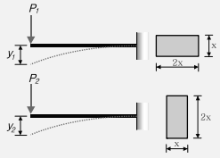 보의 길이가 같은 캔틸레버 보에서 작용하는 집중하중의 크기가 P_1=P_2일 때, 보의 단면이 그림과 같다면 최대처짐 y_1 : y_2의 비는?