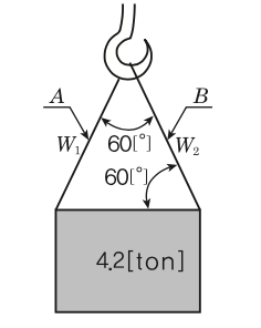 4.2[ton]의 화물을 그림과 같이 60[°]의 각을 갖는 와이어로프로 매달아 올릴 때 와이어로프 A에 걸리는 장력W_{1}은 약 얼마인가?