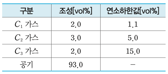 가연성 가스의 조성과 연소하한값이 표와 같을 때 혼합가스의 연소하한값은 약 몇 [vol%]인가?