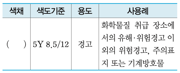 산업안전보건법령상 안전보건표지의 색채, 색도기준 및 용도 중 다음 ( )안에 알맞은 것은?