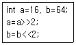 C언어로 구현된 다음 프로그램의 실행 결과에 의해 변수 a와 b에 저장된 값은? (단, “<<”는 왼쪽 시프트(Lsh), ">>"는 오른쪽 시프트(Rsh)를 의미한다.)