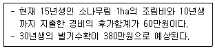 다음 조건에서 글라저(Glaser)의 보정식에 따른 15년생 현재의 평가대상 임목가는?