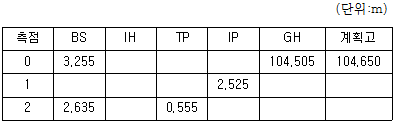 다음 종단측량 야장에서 측점 간 거리가 20\mathrm m이고 계획고를 +4\% 경사(상향)로 할 때 측점 2에서의 절ㆍ성토고는?