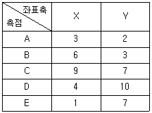 다각형의 좌표가 다음과 같을 때 면적은? (단, 측점 간 거리 단위는