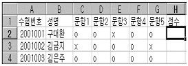 아래 시트에서 'o' 한 개당 20점으로 시험 점수를 계산하여 점수 필드에 표시하려고 할 때 [H2]셀에 들어갈 수식으로 옳은 것은?