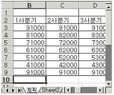 다음 시트에서 [B10]셀에 [B3:D9] 영역의 평균을 계산하고 자리올림을 하여 천의 자리까지 표시하는 함수식으로 옳은 것은?
