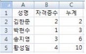 아래의 시트와 같이 누계를 구하기 위해 [C2] 셀에 수식을 입력한 후 [C3:C5] 영역은 채우기 핸들을 이용하여 계산하려고 한다. 다음 중 [C2] 셀에 들어갈 수식으로 옳은 것은?