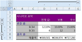 시나리오 요약 보고서가 있는 위 그림의 시트를 삭제해도 작성된 시나리오는 삭제되지 않는다.