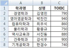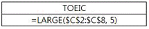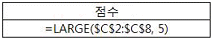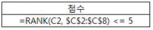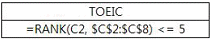 아래 시트에서 고급필터 기능을 이용하여 TOEIC 점수 상위 5위까지의 데이터를 추출하고자 한다. 다음 중 고급 필터의 조건식으로 옳은 것은?