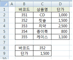 아래 워크시트에서 [B2:D6] 영역을 참조하여 [C8] 셀에 표시된 바코드에 대한 단가를 [C9] 셀에 표시하였다. 다음 중 [C9] 셀의 수식으로 옳은 것은?