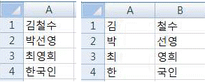 왼쪽 워크시트의 성명 데이터를 오른쪽 워크시트와 같이 성과 이름 두 개의 열로 분리하기 위해 [텍스트 나누기] 기능을 사용하고자 한다. 다음 중 [텍스트 나누기]의 분리 방법으로 가장 적절한 것은?