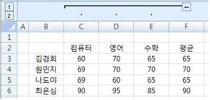 [하위 수준 숨기기]를 실행하면 컴퓨터, 영어, 수학 열은 숨겨진다.