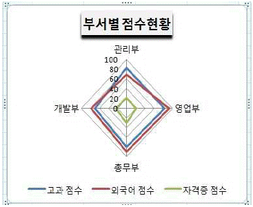 데이터 계열이 중심점에서 외곽선으로 나오는 축을 갖는다.