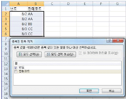 아래 워크시트에서 [A2:B6] 영역을 선택한 후 그림과 같이 중복된 항목을 제거하였다. 다음 중 유지되는 행의 개수로 옳은 것은?