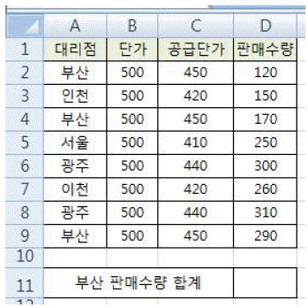 다음 중 아래 워크시트에서 '부산' 대리점의 판매수량의 합계를 [D11] 셀에 구하기 위한 수식으로 옳지 않은 것은?