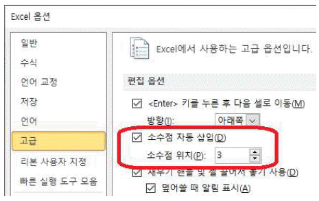 다음 중 아래 그림과 같이 소수점 자동 삽입의 소수점 위치를 '3'으로 설정한 상태에서 숫자 5를 입력하였을 때 화면에 표시되는 결과로 옳은 것은?