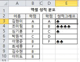 다음 중 학점 [B3:B10]을 이용하여 [E3:E7] 영역에 학점별 학생 수만큼 '♣' 기호를 표시하고자 할 때, [E3] 셀에 입력해야 할 수식으로 옳은 것은?