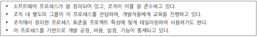 다음은 A 회사를 대상으로 CMM/CMMI의 성숙도를 평가하기 위해 평가자들이 파악한 내용들을 간략하게 정리한 것이다. 이 내용을 근거로 이 회사의 성숙도 수준을 평가한 것으로 가장 적절한 것은?