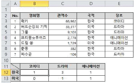 아래 시트에서 국적별 영화 장르의 편수를 계산하기 위해 [B12] 셀에 작성해야 할 배열수식으로 옳지 않은 것은?
