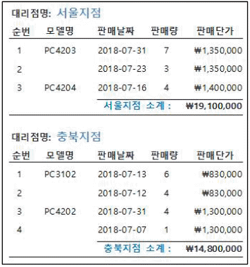 지점별 소계가 표시된 텍스트 상자는 그룹 바닥글에 삽입하였다.