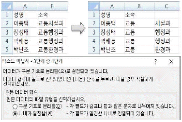 다음 중 아래와 같이 왼쪽 그림의 [B2:B5] 영역에 [텍스트 나누기]를 실행하여 오른쪽 그림과 같이 소속이 분리되도록 실행하는 과정으로 옳지 않은 것은?