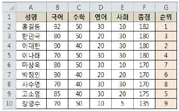 아래 워크시트에서 순위[G2:G10]는 총점을 기준으로 구하되 동점자에 대해서는 국어를 기준으로 순위를 구하였다. 다음 중 [G2] 셀에 입력된 수식으로 옳은 것은?
