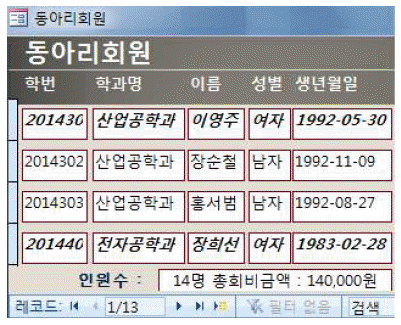 테이블의 데이터시트 보기에서 여자 회원 레코드들을 모두 선택한 후 서식을 설정한다.