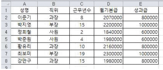 [A1] 셀을 클릭하고 < F8 >키를 누른 뒤에 <→>키를 눌러 E열까지 이동하고 <↓>키를 눌러 8행까지 선택한다.