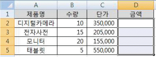 아래 시트에서 [D2:D5] 영역을 선택한 후 배열 수식으로 한 번에 금액을 구하려고 한다. 다음 중 이를 위한 수식으로 옳은 것은? (금액 = 수량 * 단가)