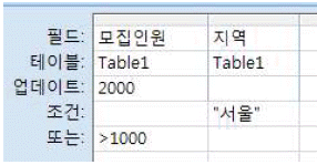 UPDATE Table1 SET 모집인원 = 2000 WHERE 지역=“서울” OR 모집인원>1000;