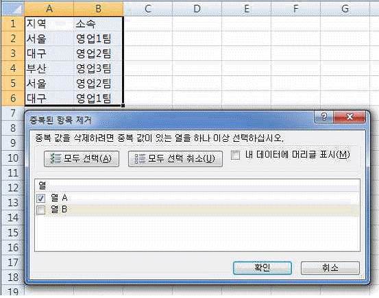 [중복된 항목 제거] 대화상자에서 [내 데이터에 머리글 표시]를 선택하면 대화상자의 '열' 목록에 '열 A' 대신 '지역', '열 B' 대신 '소속'이 표시된다.