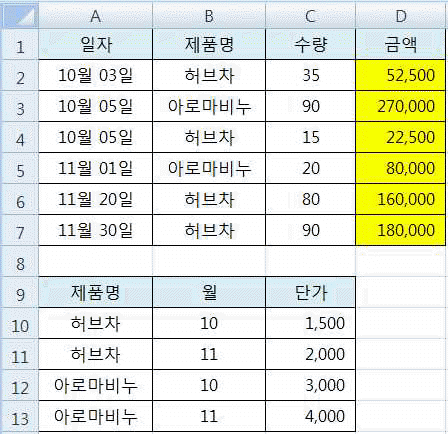 아래 워크시트에서 일자[A2:A7], 제품명[B2:B7], 수량[C2:C7], [A9:C13] 영역을 이용하여 금액[D2:D7]을 배열수식으로 계산하고자 한다. 다음 중 [D2] 셀에 입력된 수식으로 옳은 것은?(단, 금액은 단가*수량으로 계산하며, 단가는 [A9:C13] 영역을 참조하여 구함)