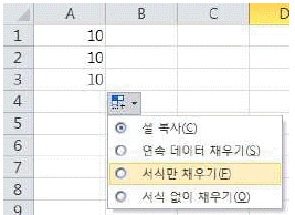 서식 없이 채우기: [A2] 셀과 [A3] 셀에 [A1] 셀의 서식은 복사되지 않고 [A1] 셀의 값 10이 입력된다.