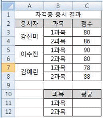 다음 중 아래 시트에서 자격증 응시자에 대한 과목별 평균을 구하려고 할 때, [C11] 셀에 입력해야 할 배열 수식으로 옳은 것은?