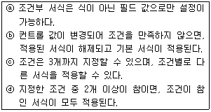 다음 중 폼이나 보고서에서 조건에 맞는 특정 컨트롤에만 서식을 적용하는 조건부 서식에 대한 설명으로 옳은 것은?(오피스 2007 기준 문제 입니다. 자세한 내용은 해설을 참고하세요.)