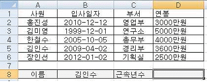 다음 중 아래의 워크시트에서 ‘김인수’ 사원의 근속년수를 오늘 날짜를 기준으로 구하고자 할 때, [D8] 셀에 입력할 수식으로 옳은 것은?